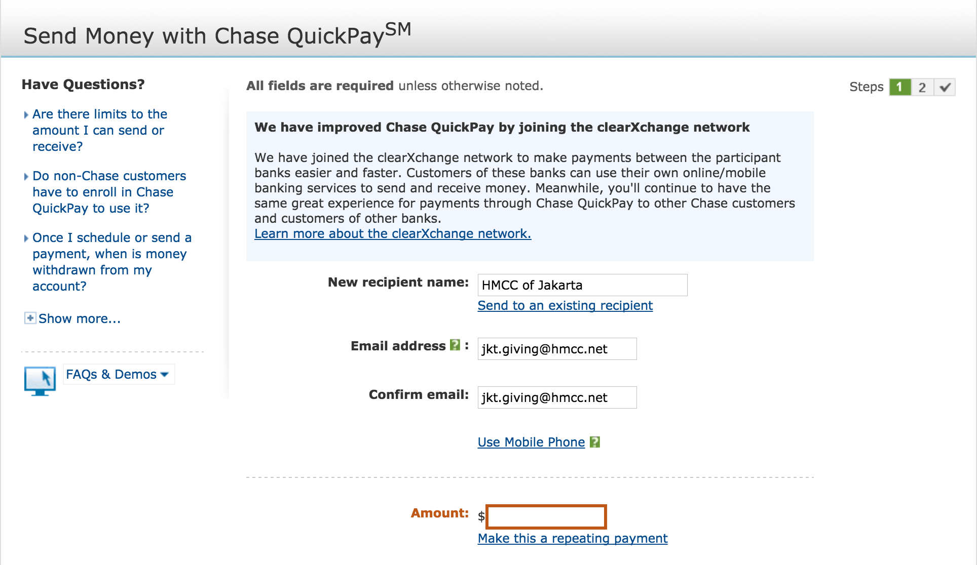 Send money with "HMCC of Jakarta" as the recipient and using the email address: jkt.giving@hmcc.net.